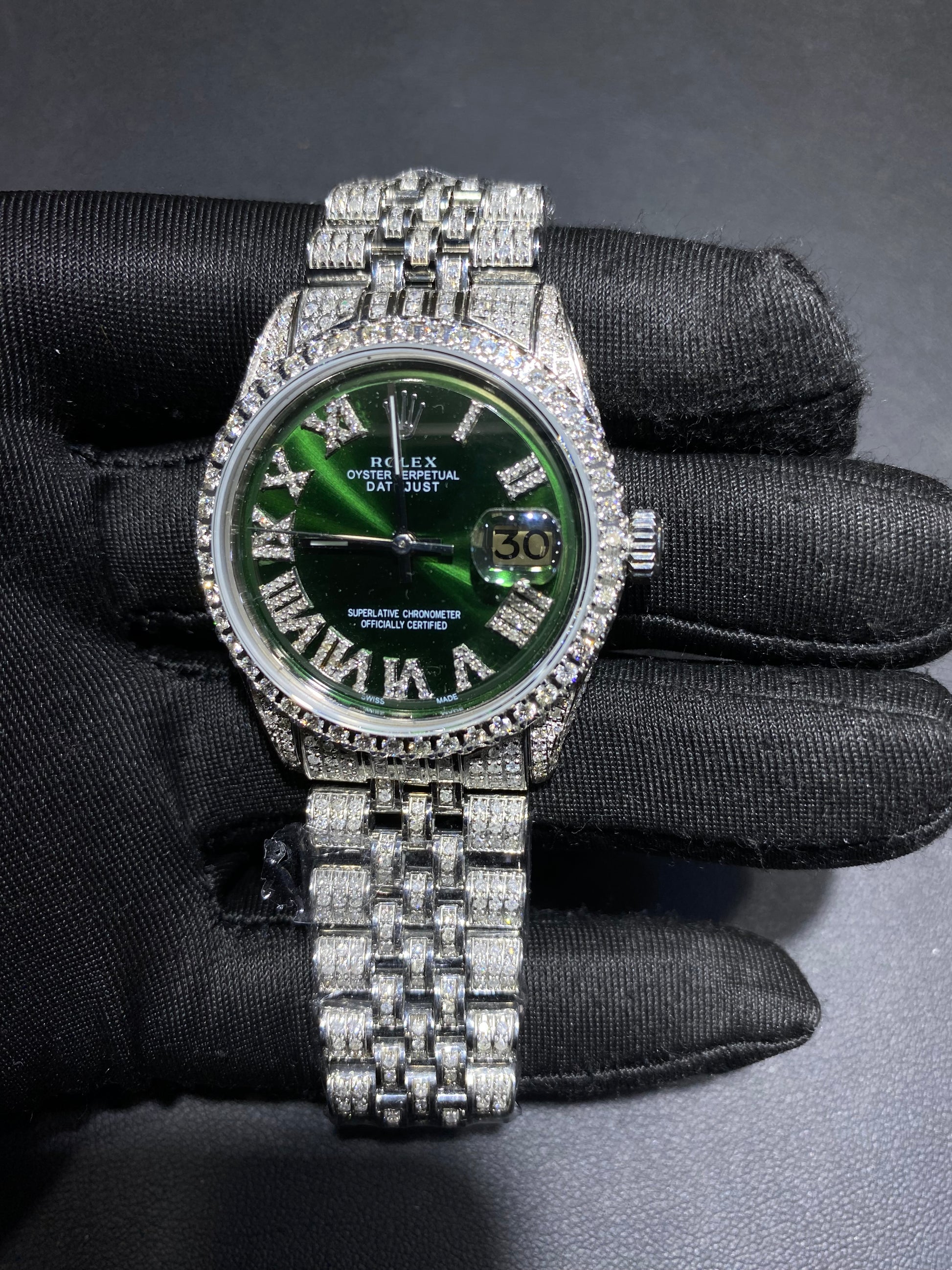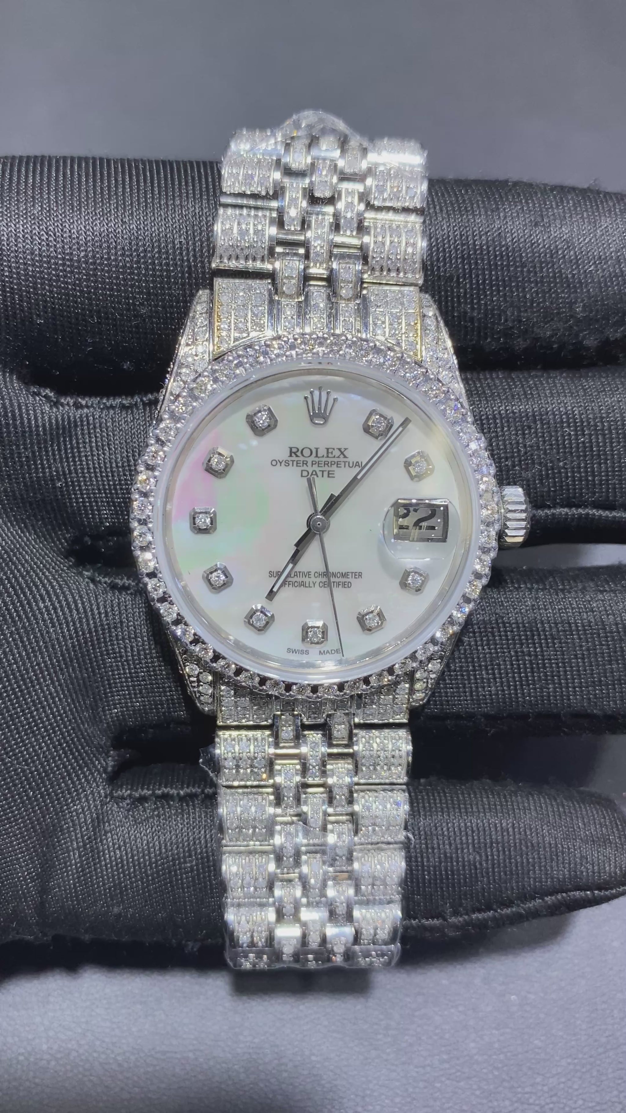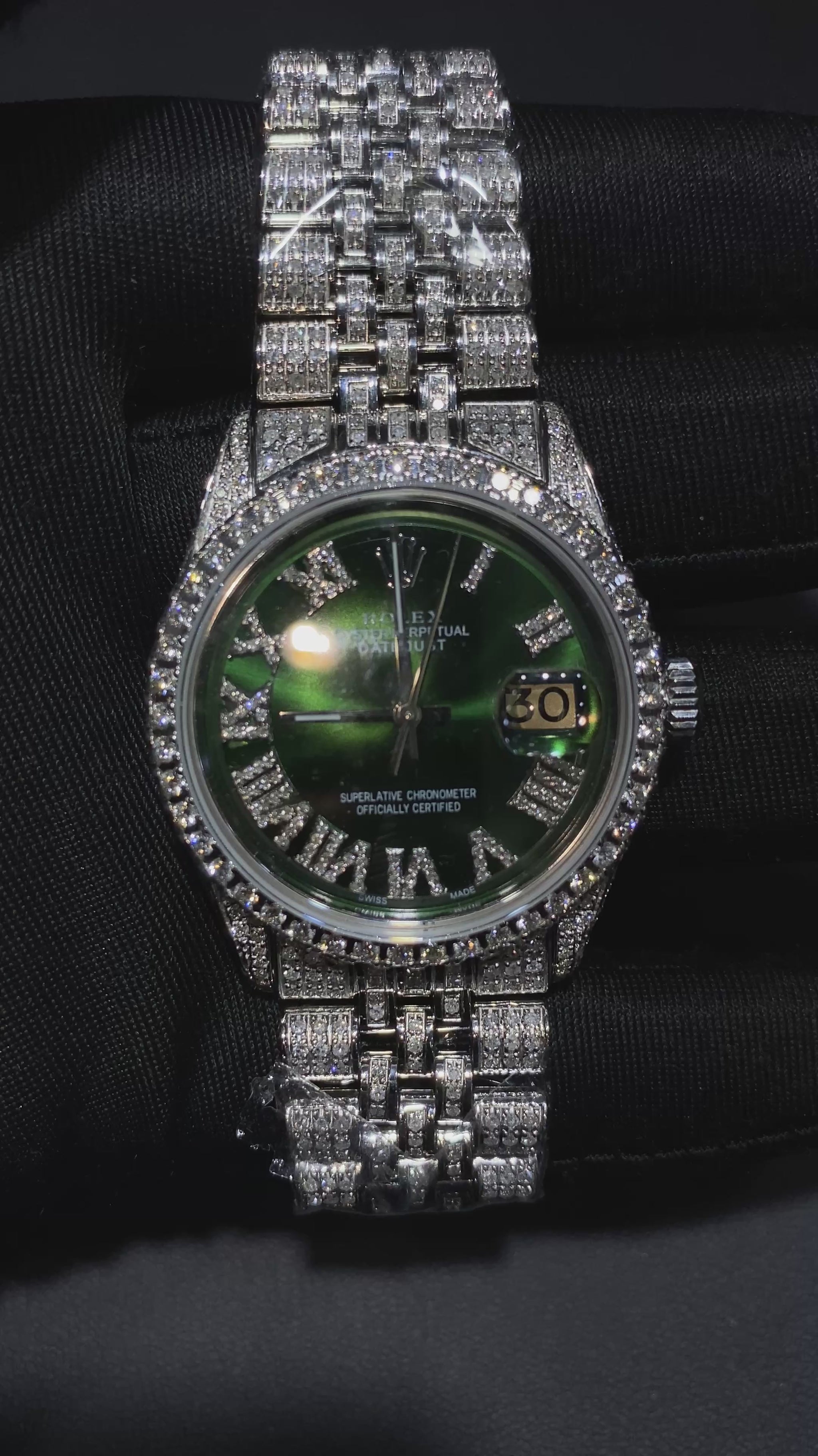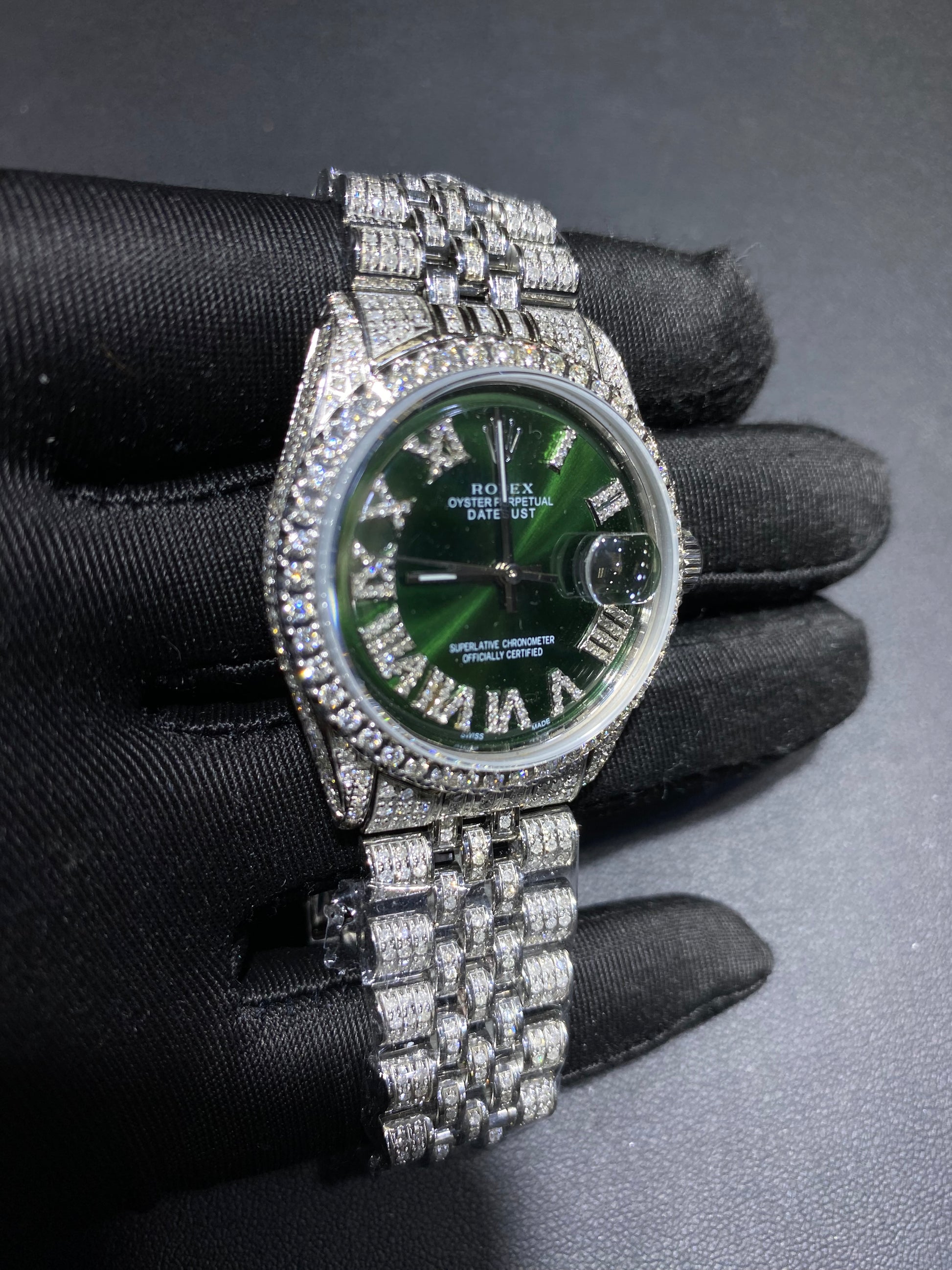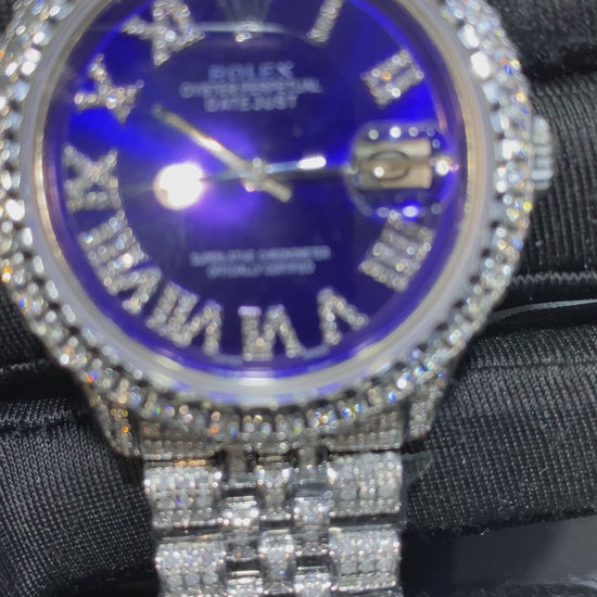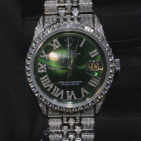Each watch is professionally customized with hand-set diamonds across the bezel, lugs, and bracelet, paired with a striking dial option including Mother of Pearl, Green Sunburst, or Blue Sunburst finishes. Roman numeral diamond hour markers elevate the face, creating a perfect balance between classic design and modern luxury.