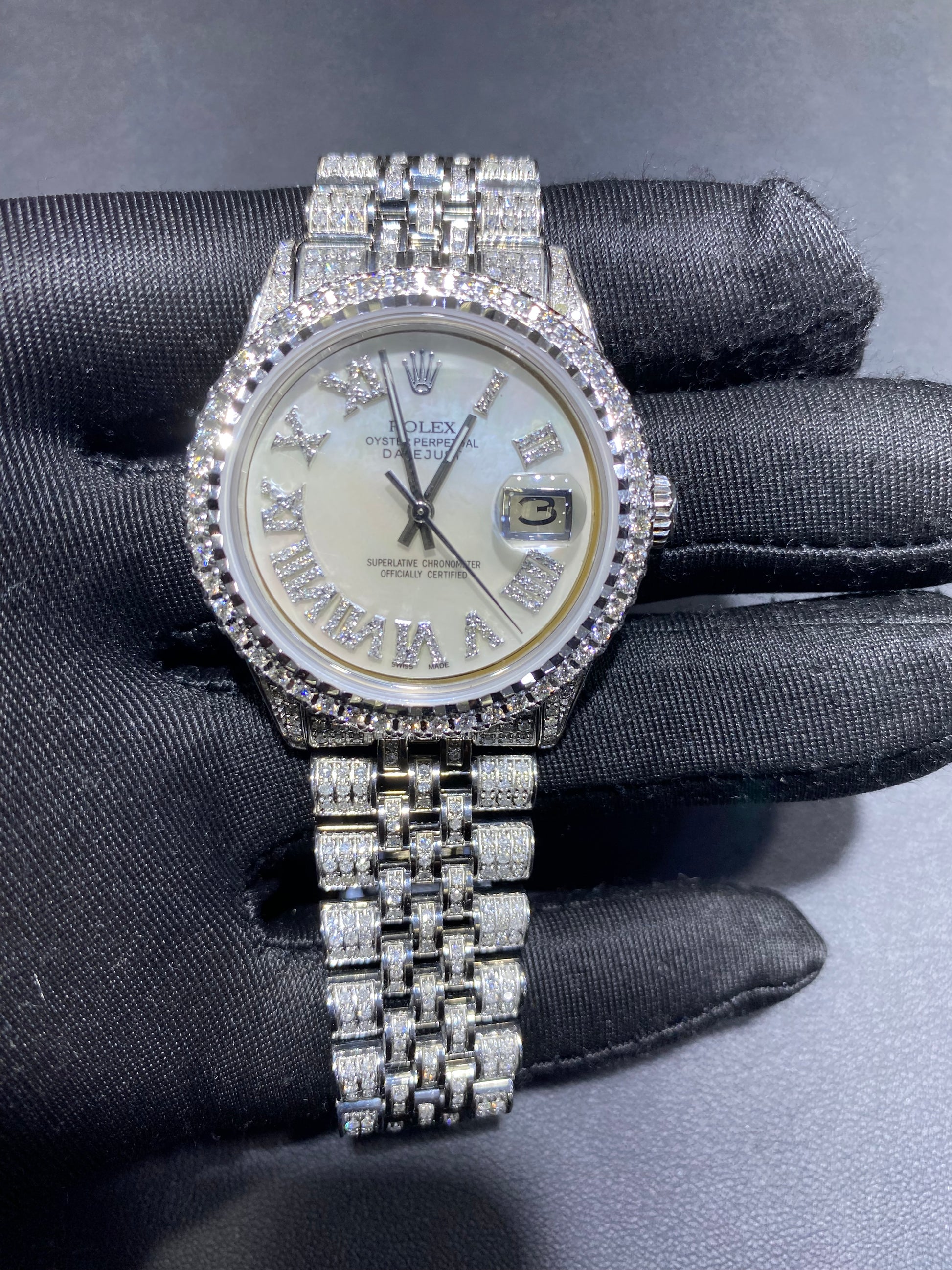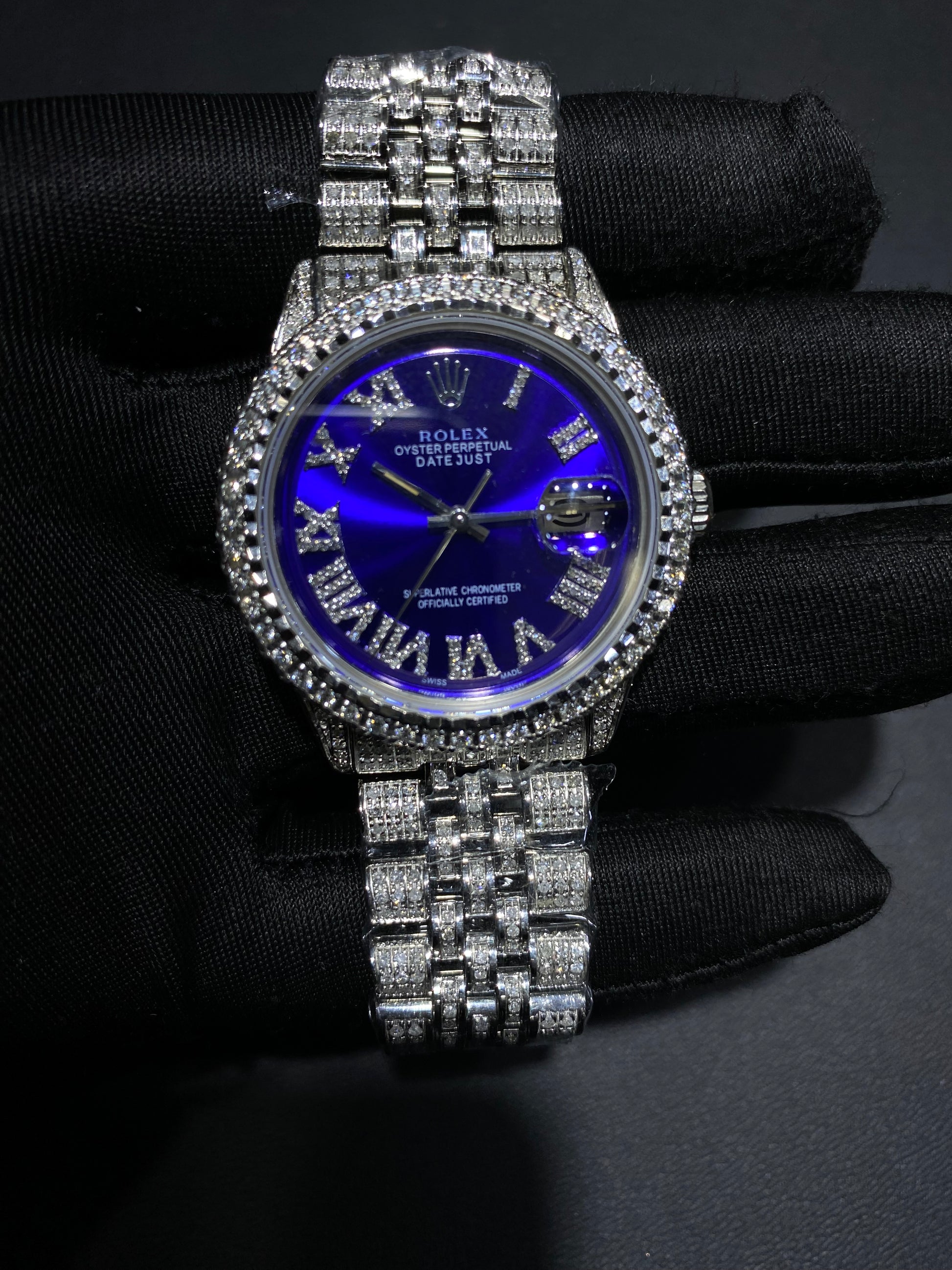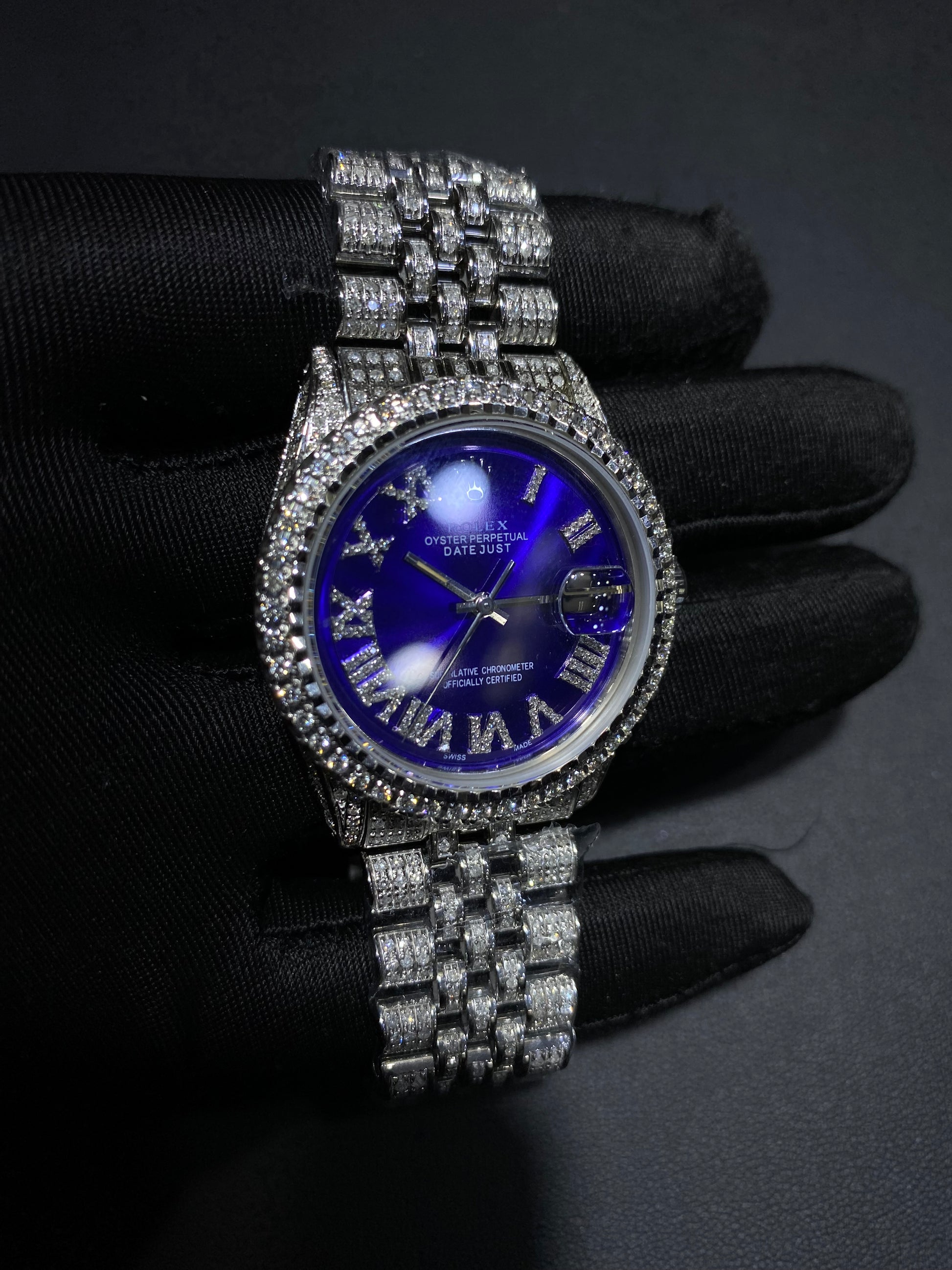 This timepiece features aftermarket custom diamond work professionally added to enhance appearance. The original manufacturer does not produce this configuration. All customization is performed independently and inspected prior to sale.
