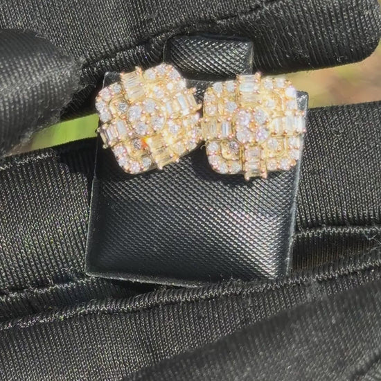 Yellow Gold Baguette & Round Diamond Grid Cluster Earrings 0.81ct– Iced Out Hip Hop Studs