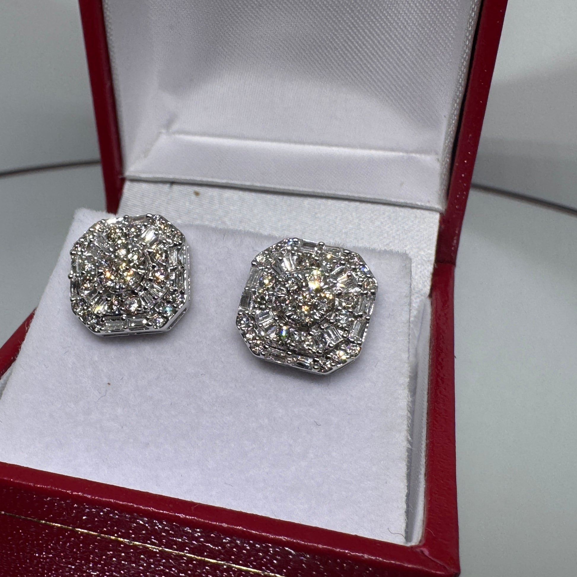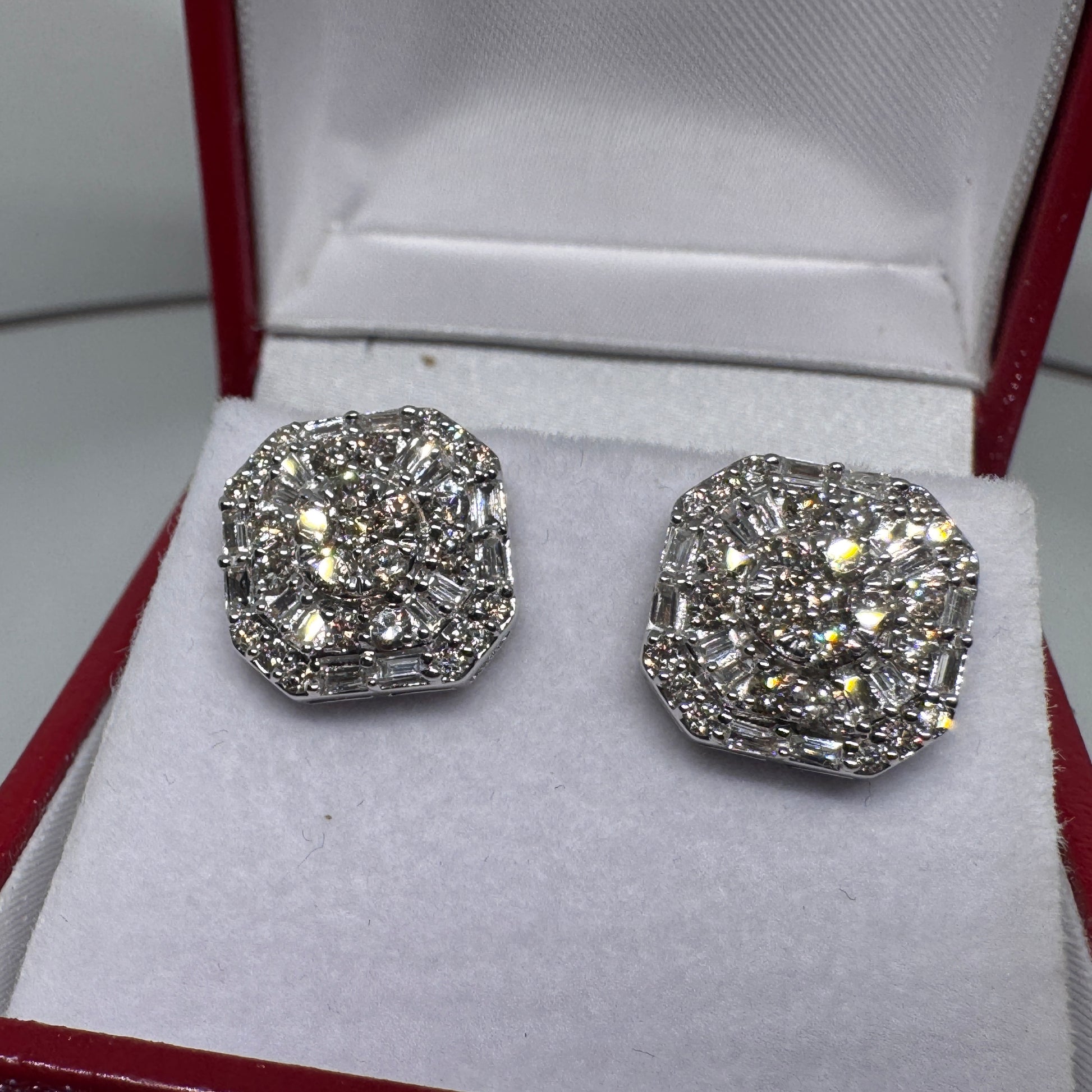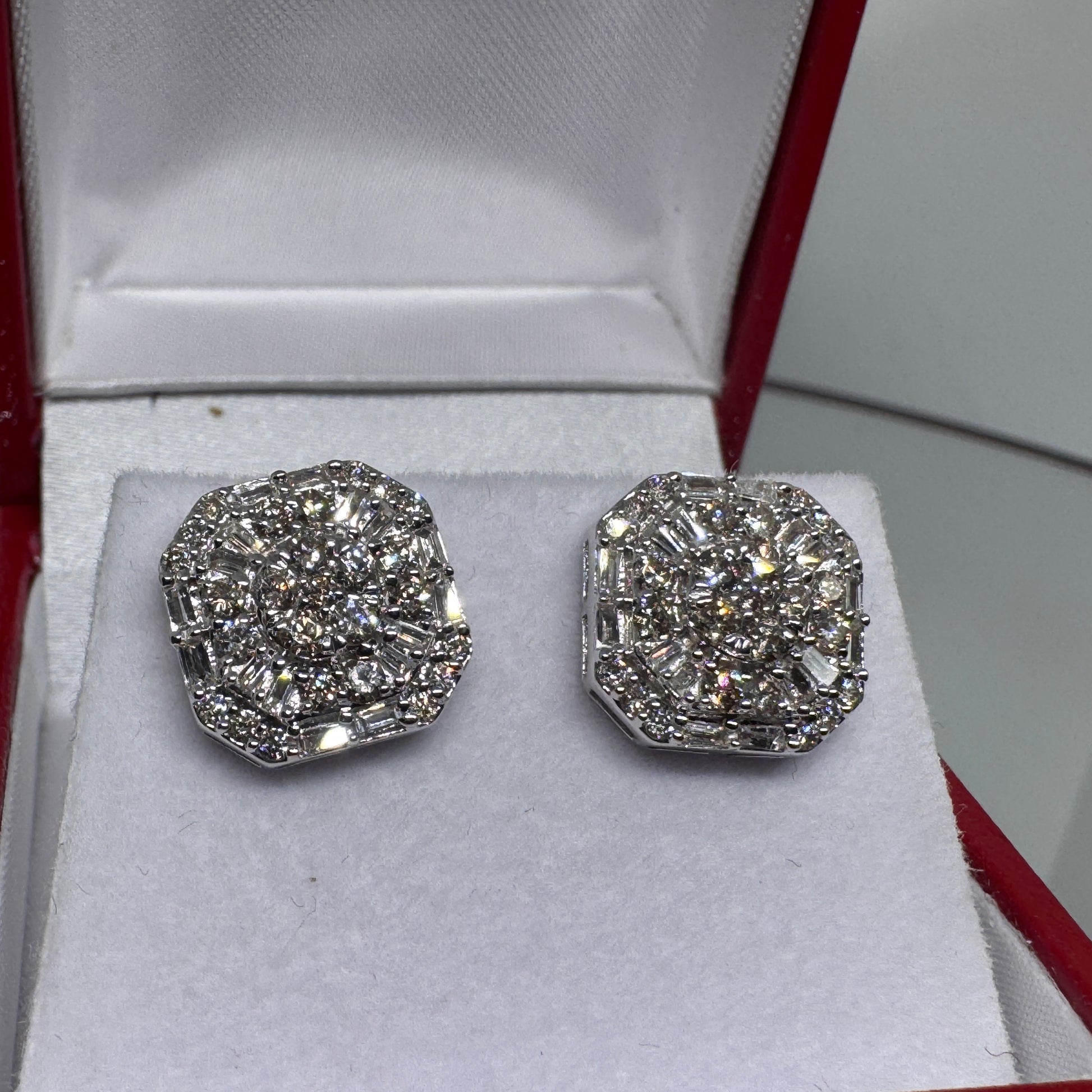 - Design: Octagon-shaped studs with baguette & round cluster setting